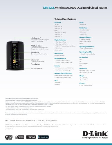 Upgrade to AC Performance: Today’s households are connecting more devices than ever before – with more and more iPhones, Androids, tablets, and laptops laying around in any given home, it’s important that each device gets the speed and coverage it deserves. By upgrading your current network to wireless AC, you can immediately enjoy the benefits of faster wireless speeds, increased home coverage – all with less wireless interference so you can enjoy doing what you love most. Delivering Wi-Fi dual band speeds of up to 1000Mbps, the DIR-820L is the perfect solution for those looking to enjoy HD video streaming, fast file transfers, and lag-free video chatting. Backward Compatibility: While the DIR-820L delivers AC performance to your home network, it is also backward compatible with all of your existing wireless devices. This means you can enjoy all the benefits of wireless AC without worrying about annoying compatibility issues. Simply use a web browser or download the QRS Mobile app to your mobile device, follow the intuitive setup wizard and you’ll have your wireless AC home network up and running in minutes. Dual Band Advantage: The Wireless AC1000 Dual Band Cloud Router delivers dual band performance for intelligent, versatile, interference-free bandwidth. Check your email and surf the Internet on the 2.4GHz band; game and make Skype calls and stream HD videos with less interference on the 5GHz band. Whatever you like to do online, dual band has you covered. App-Enabled & Cloud Services: D-Link’s Cloud Routers also provide the added benefit of remote network management and simple setup via my D-Link Cloud Services. Take advantage of everything my D-Link Cloud has to offer through the QRS Mobile and my D-Link Lite apps. With these free mobile apps that are available for iOS and Android devices, you can: • my D-Link Lite – Monitor and control your home network from anywhere; • QRS Mobile – Quickly setup your router from your mobile phone or tablet